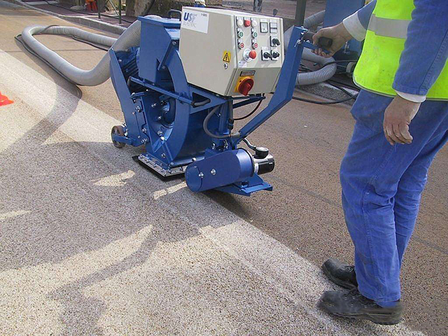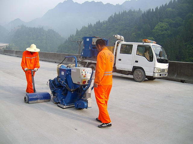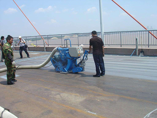 橋梁混凝土鋪裝層處理采用拋丸工藝,即利用拋丸機(jī),拋除混凝土表面的浮漿。使用拋丸處理的表面粗糙均勻;不會(huì)破壞原混凝土結(jié)構(gòu)和平整度,并且可以完全去除浮漿和起砂,100%“創(chuàng)面”、露骨;但同時(shí)不會(huì)造成骨料的松動(dòng)和微裂紋,為增強(qiáng)混凝土與瀝青面層提供更好的粘結(jié)。
