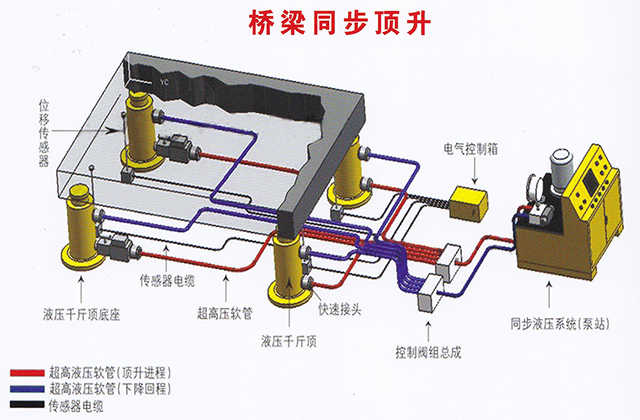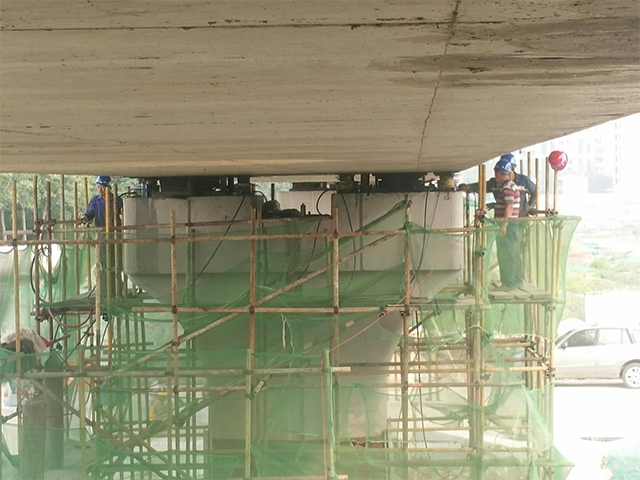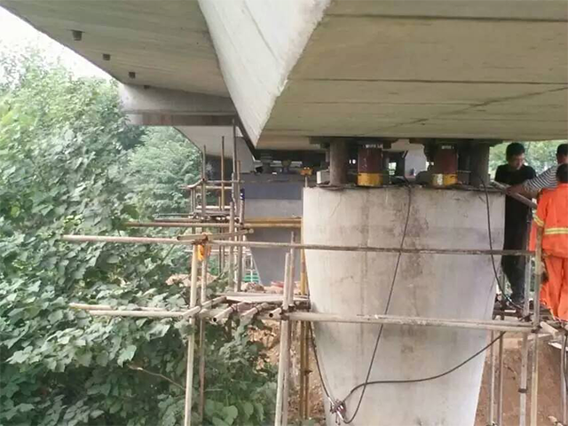 橋梁頂升即是在原橋臺(tái)附近開挖基坑澆筑臨時(shí)砼作為頂升支架的基礎(chǔ),頂升支架采用無縫鋼管,無縫鋼管加工高度根據(jù)現(xiàn)場情況實(shí)測高度進(jìn)行加工,保證同軸無縫鋼管上部放置工字梁面處于同一高度,鋼管上放置頂升用千斤頂,千斤頂上放置工字梁作為分配梁與梁底之間用組合鋼楔緊密接觸。并在橋臺(tái)或墩柱外側(cè)安裝防位移裝置(高度根據(jù)現(xiàn)場實(shí)際情況而定)。頂?shù)轿缓舐淞簤|好臨時(shí)支撐柱。在原橋臺(tái)、墩上進(jìn)行支座墊石放樣,鑿除埋設(shè)支座墊石基槽并打磨平整,調(diào)制環(huán)氧砂漿安放支座墊石,對支座墊石進(jìn)行焊接,然后安放橡膠支座并找平、落梁。